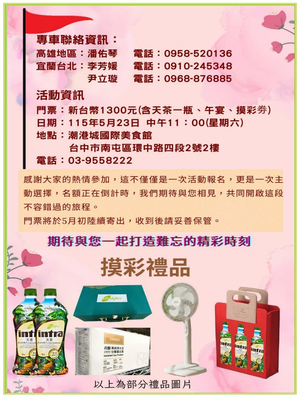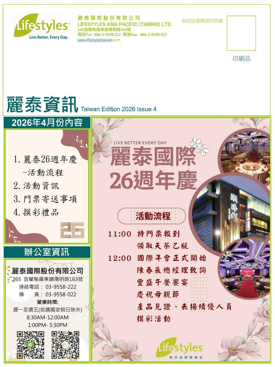 麗泰4月月刊資訊 ※26週年活動流程 11:00 持門票報到→領取天茶乙瓶 12:00 國際年會正式開始 陳春辰總經理致詞 豐盛午餐饗宴-慶祝母親節 產品見證、表揚績優人員 摸彩活動 ※26週年活動資訊 台中 潮港城國際美食館舉辦『26週年慶』 115年5月23日(星期六) 中午 11:00 am 門票:1300元(含贈天茶1瓶、午宴及摸彩) ※門票寄送事項 門票將於5月初陸續寄出,收到後請妥善保管。 ※年會獎品資訊