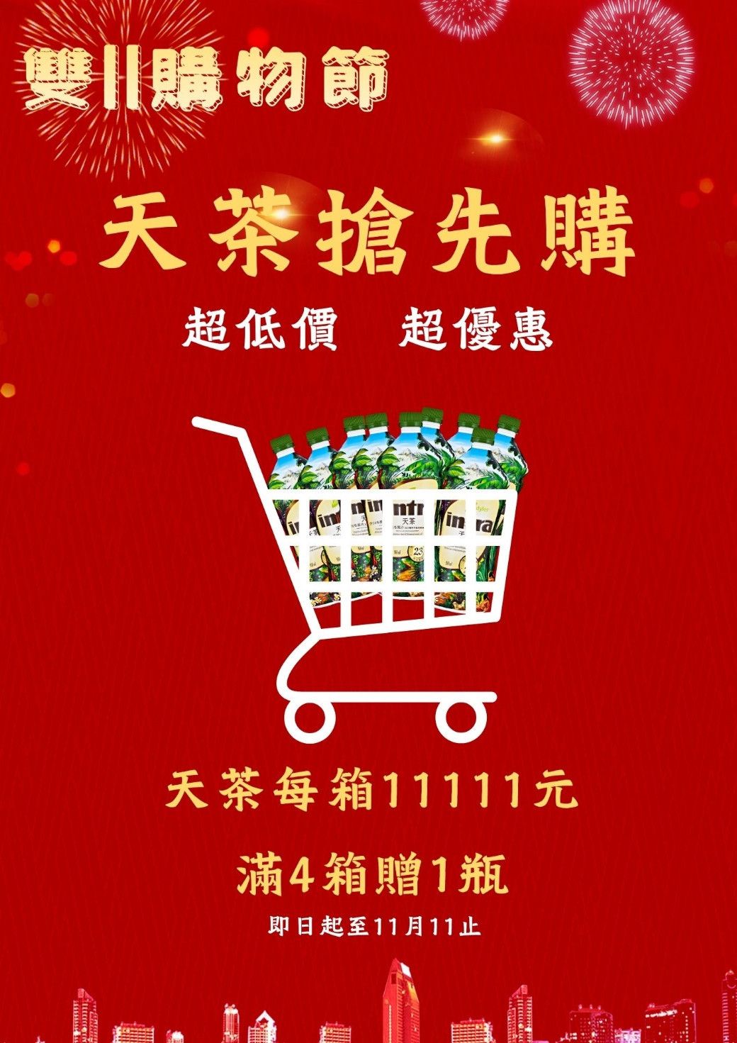 嗨翻雙11即日起至114年11月11日天茶滿一箱超殺優惠11111元購滿兩箱免運費購買四箱加碼"贈送天茶1瓶"如此優惠,快把握機會下單 註:1.天茶10箱優惠套裝不得與此優惠合併2.麗泰公司保有最終修改、變更、活動解釋及取消本活動之權利。